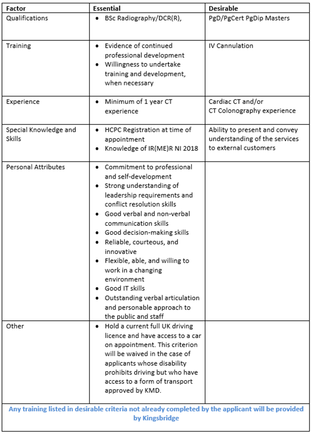 The successful candidate will be responsible for producing high quality diagnostic images and assist with the daily operational of the CT department within the Kingsbridge Healthcare Group. The post holder will ensure that high standards of service with a patient focused approach is maintained while striving to maximise departmental efficiency on a daily basis.