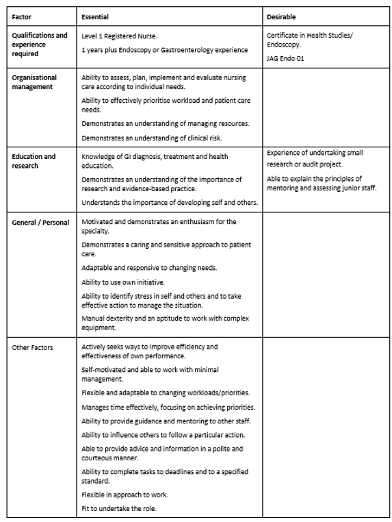 1. To provide skilled nursing care and to demonstrate a high standard of nursing practice in the assessment, implementation and evaluation of patient care to patients within the Endoscopy suite and Theatre environment. This may include patient care, assisting the endoscopist within the scope operator role.